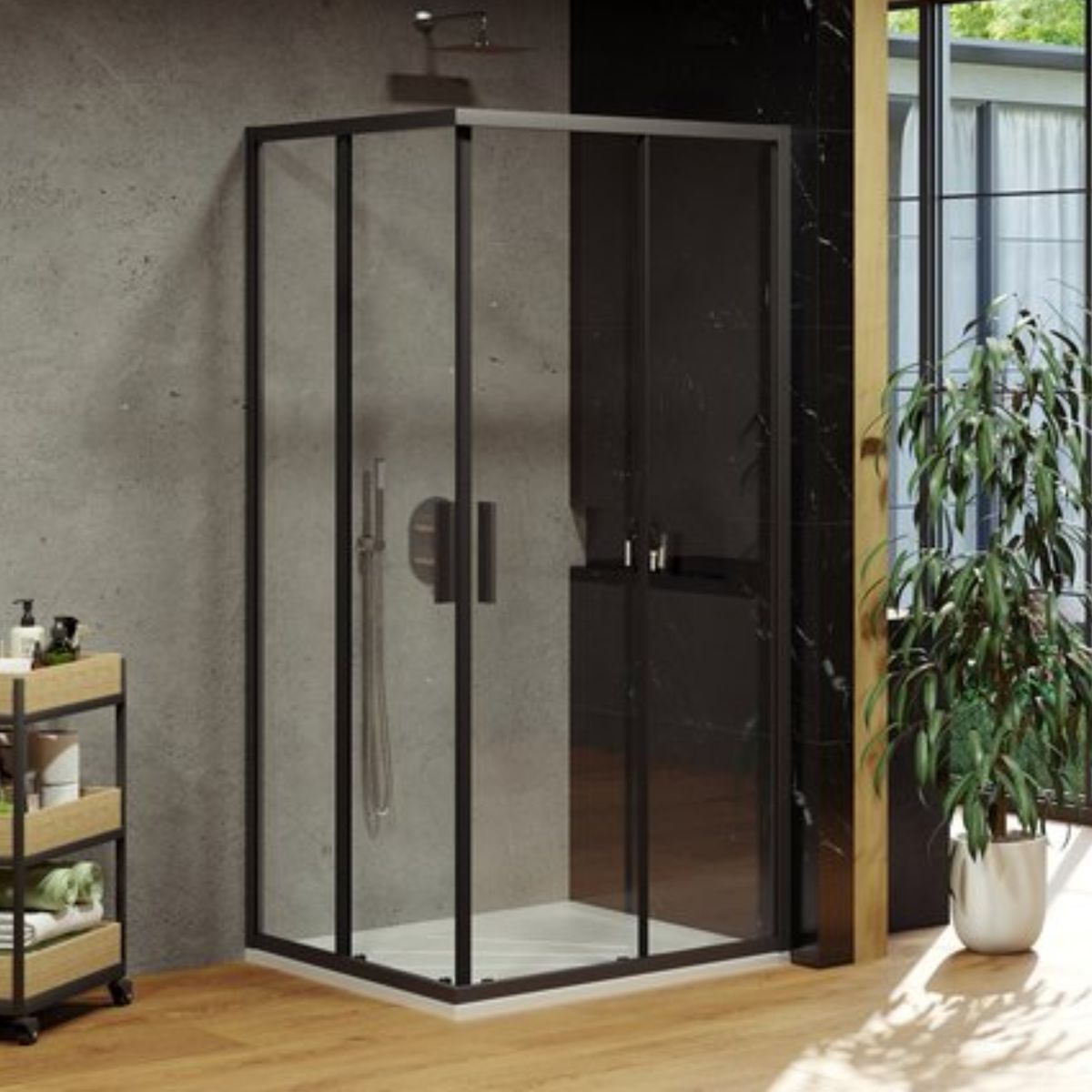 Cabine de douche avec large entrée d'angle.