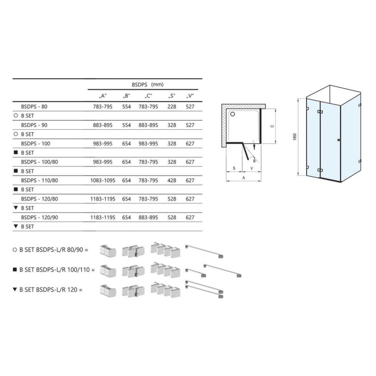 La cabine de douche se compose d'une porte de douche en deux parties (avec un élément fixe et un élément mobile qui forme la porte) et d'une paroi fixe en une seule partie. La version gauche ou droite du produit est déterminée par l'emplacement des charnières vu de l'extérieur. Le mécanisme de levage assure le verrouillage de la porte en position de base, sa fermeture automatique et son soulèvement au-dessus du seuil lors de l'ouverture. La version gauche du verre ne peut être combinée qu'avec le B SET dans la version gauche. Installation dans un coin carrelé de la salle de bains sur un receveur de douche Ravak : Perseus Pro, Perseus Pro Flat, Perseus Pro Chrome ou directement sur le sol avec un siphon linéaire intégré ou une grille d'évacuation. La cabine de douche BSDPS est livrée dans un kit : les éléments en verre dans un emballage et les pièces métalliques et un support long dans un autre emballage (B SET).