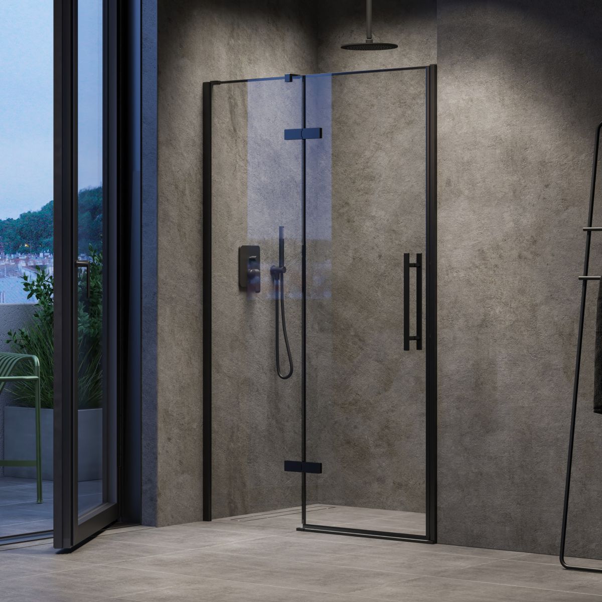Porte de douche en deux parties Cool ! Modèle noir avec remplissage en verre transparent et couche protectrice Ravak AntiCalc®. Système d'ouverture à charnières. Produit universel, sans version droite ou gauche.