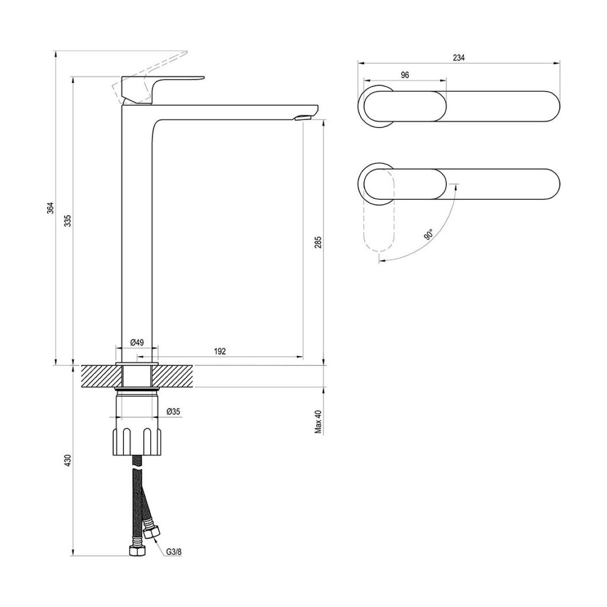 - flexibles de raccordement : flexibles 700 mm, diamètre DN6, G3/8