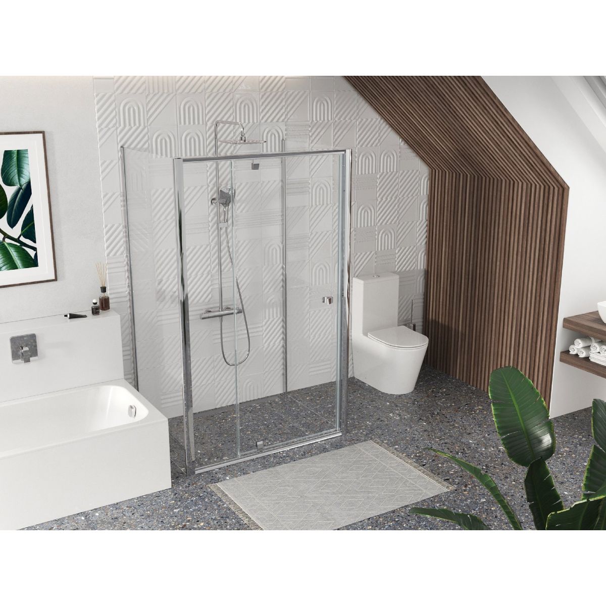 Le produit se compose d'un élément fixe simple et d'un élément pivotant qui forme la porte. En tournant le produit de 180°, vous obtenez une version gauche ou droite de l'ouverture de la porte. Montage dans une niche ou dans un coin carrelé de la salle de bains en combinaison avec une paroi fixe PPS sur un receveur de douche Ravak : Perseus Pro, Perseus Pro Flat, Perseus Pro Chrome, Gigant Pro, Gigant Pro Flat, Gigant Pro Chrome ou directement sur le sol avec un siphon linéaire intégré ou une grille d'évacuation. En combinant la porte avec deux parois fixes de type PPS, vous pouvez créer une cabine de douche en forme de « U ». À l'aide du profilé d'élargissement PNPS, il est possible d'élargir les produits de 20 mm, ce qui permet de les adapter parfaitement aux irrégularités de construction jusqu'à 4 cm de chaque côté.