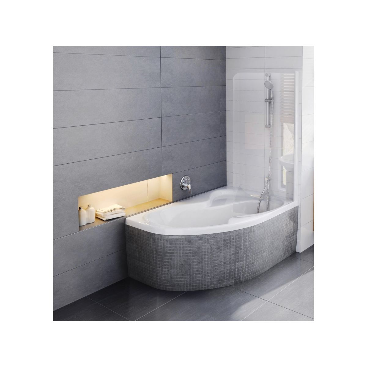 Baignoire ou cabine de douche ? Vous n'avez plus à choisir. Rosa II allie le confort d'une baignoire à l'espace d'une cabine de douche grâce à l'utilisation d'un pare-baignoire dédié. Variante droite.
