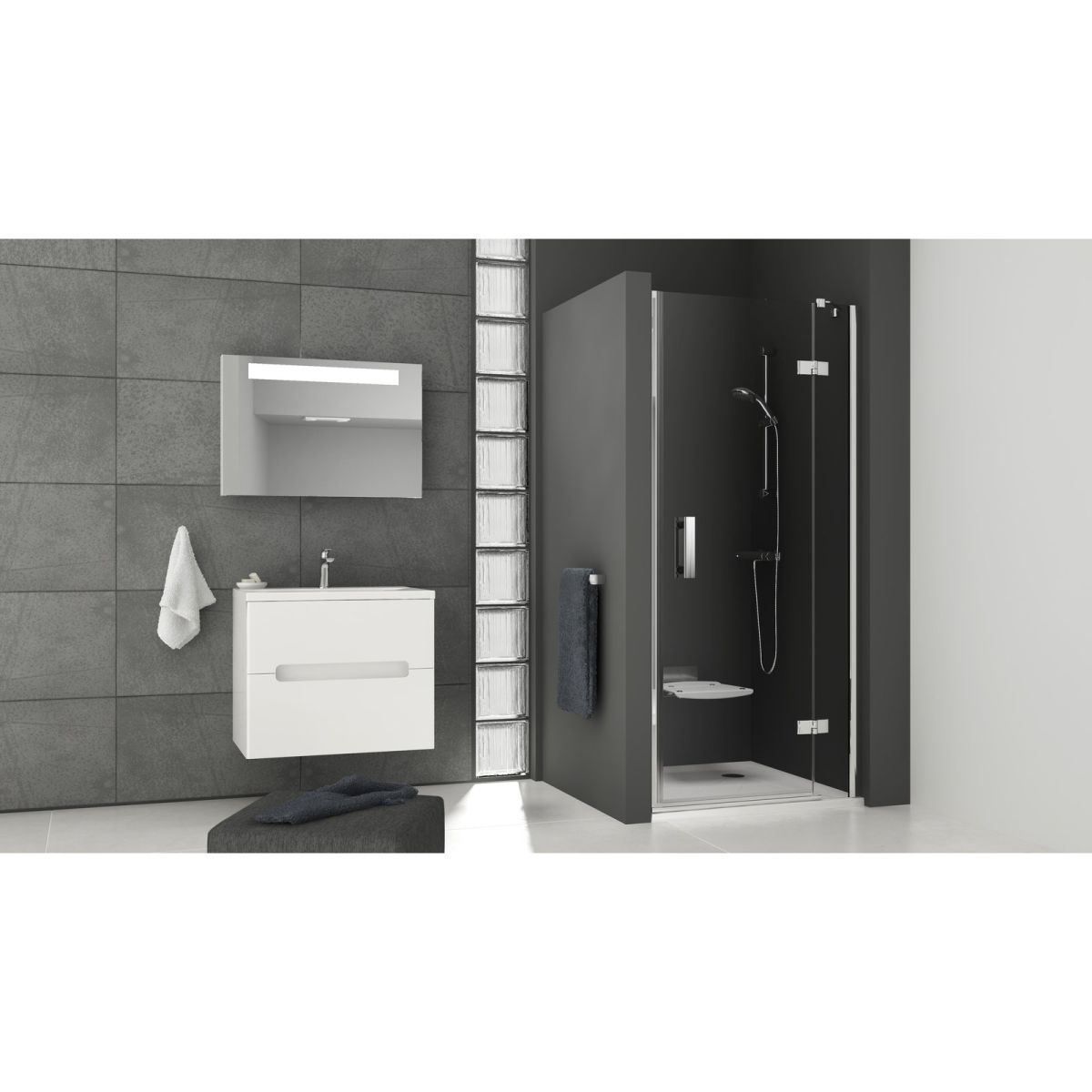 Installation dans une niche sur un receveur Ravak : Angela, Perseus Pro, Perseus Pro Flat, Perseus Pro Chrome, Gigant Pro, Gigant Pro Flat, Gigant Pro Chrome ou directement sur le sol avec un écoulement linéaire intégré ou une grille d'écoulement. La variante B est destinée à une ouverture de 16 mm plus grande que la taille standard du produit. Pour le raccordement à une paroi fixe, nous recommandons de choisir une porte de type B.