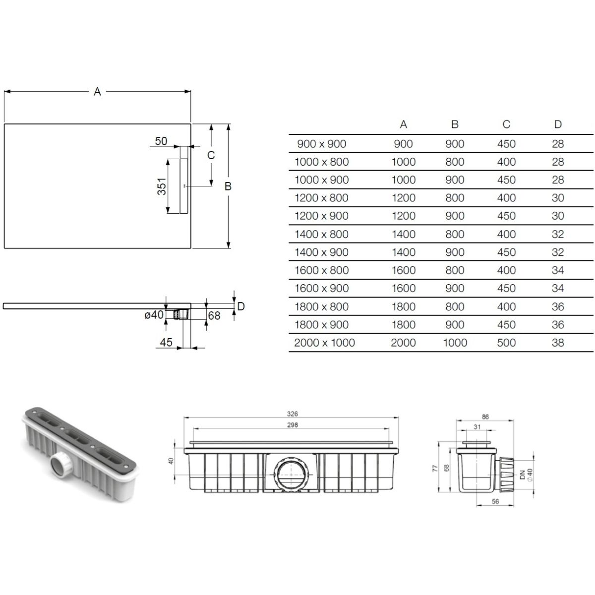 - hauteur du siphon à partir du fond du receveur de douche : 68 mm
