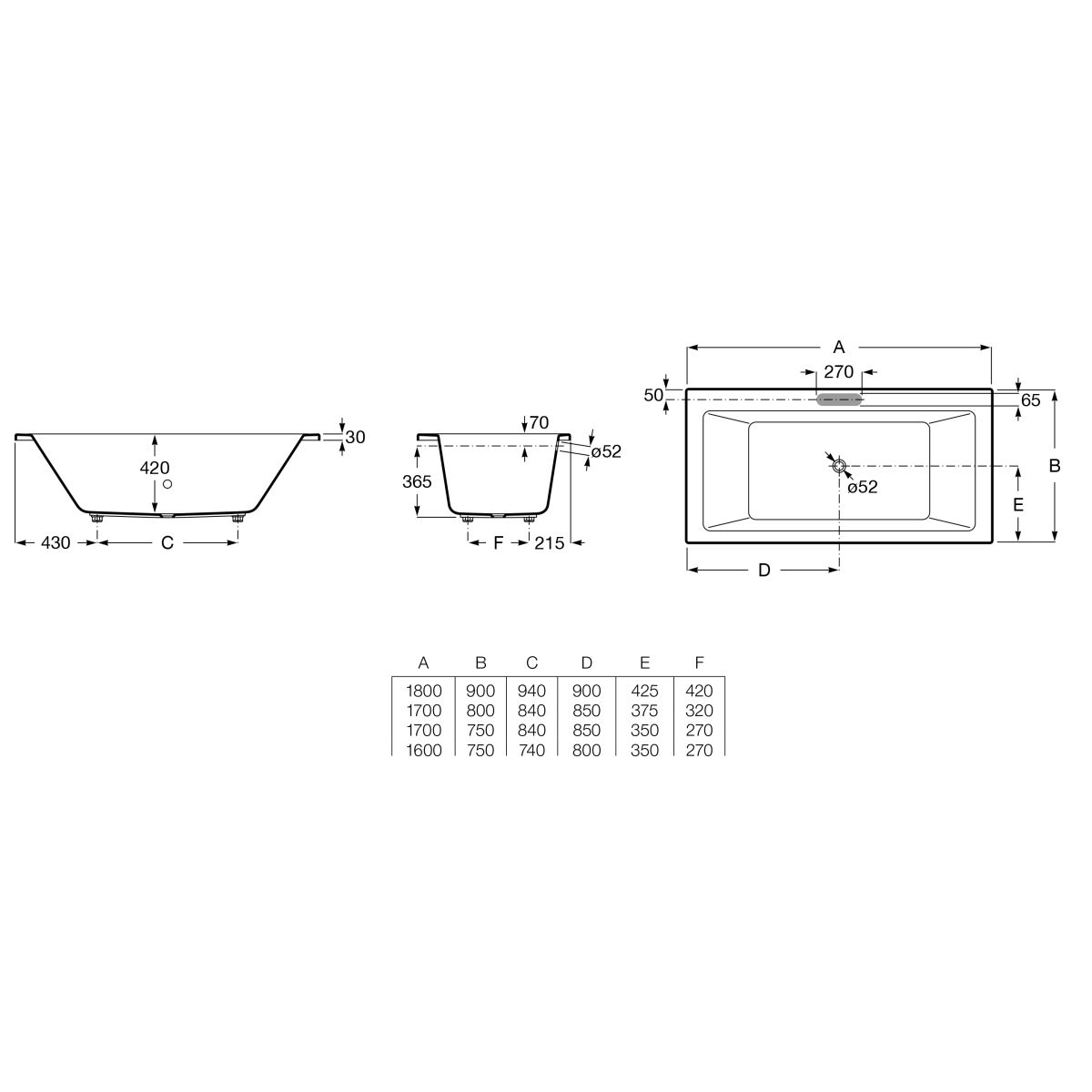 - diamètre de l'écoulement : 52 mm
