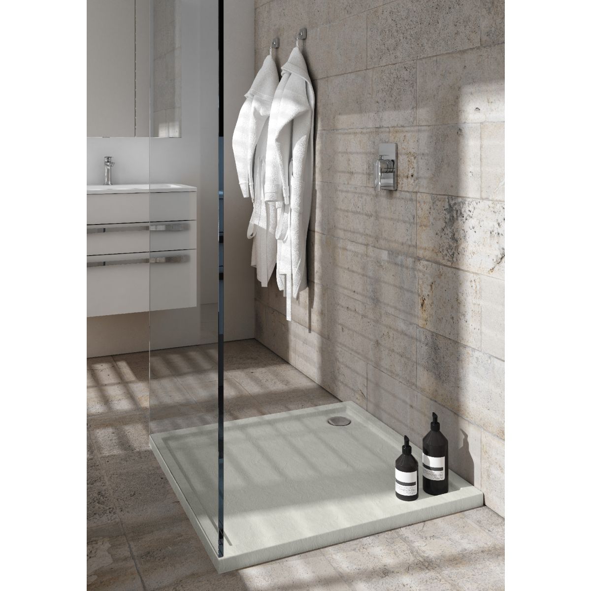 La série Caspar New Cement Stone a la hauteur la plus basse des séries de receveurs de douche standard que nous proposons. Les receveurs de douche de cette série peuvent être installés sans seuil. Cette installation augmentera le confort des personnes âgées ou à mobilité réduite sans perdre leur caractère unique. La série Caspar New Cement Stone est un classique avec une touche de modernité. Ces receveurs de douche sont de couleur ciment (RAL 7038) et, grâce à leur structure en pierre, offrent une protection contre les glissades et les chutes (classe "A" selon DIN 51097).