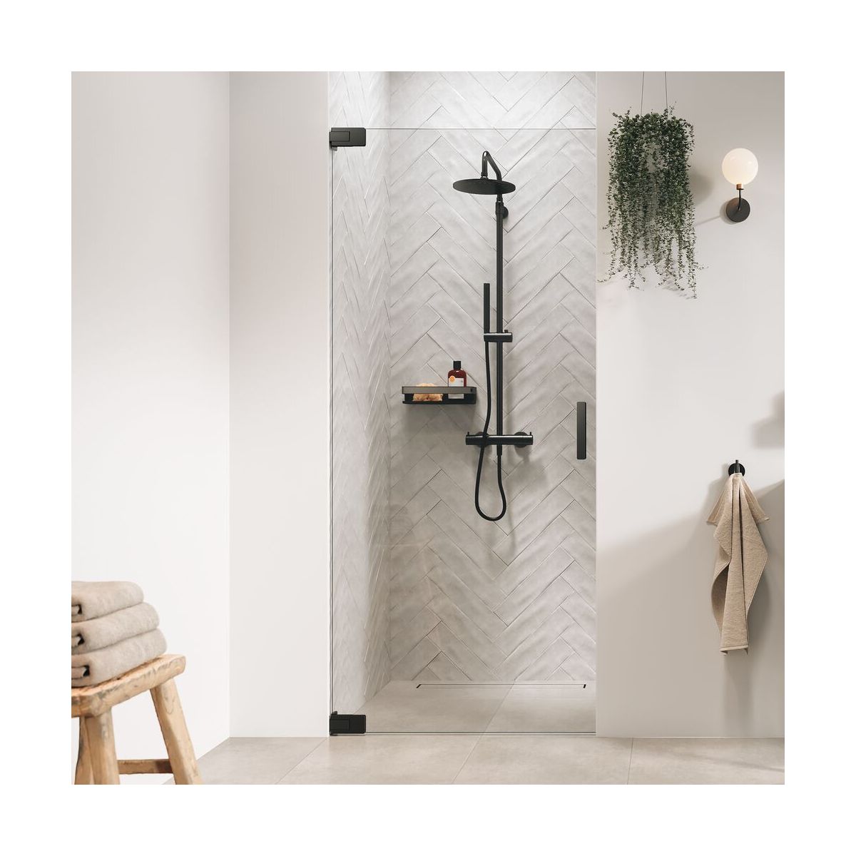 Ajoutez un confort supplémentaire à votre salle de bains avec la porte battante Pure pour l'alcôve. Grâce à son design minimaliste, votre salle de bains paraît immédiatement spacieuse et ouverte. La porte mesure 79,5 cm de large et jusqu'à 200 cm de haut, ce qui apporte plus de chaleur et de confort lors de la baignade. Les fixations en acier inoxydable de haute qualité assurent une connexion plate au verre de sécurité de 8 mm d'épaisseur avec un revêtement anti-calcaire. Cela permet de garder le verre propre et de le sécher facilement après le bain. Qui n'en voudrait pas ? Cette porte à charnières peut s'ouvrir vers l'intérieur ou l'extérieur et est équipée d'un système de fermeture automatique pour une fermeture facile. Les charnières et la poignée sont en gris brossé. Une finition sophistiquée et élégante qui convient à une salle de bains moderne et minimaliste.