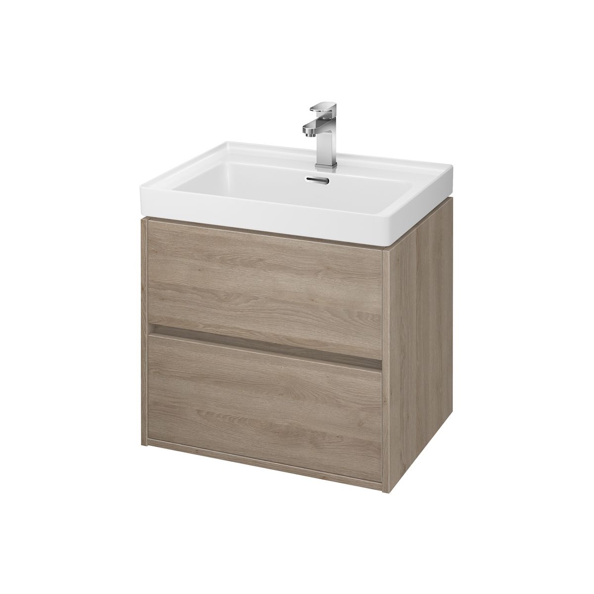 L'ensemble comprend un meuble-lavabo CREA 60 à suspendre et un meuble-lavabo CREA 60. La façade et le corps du meuble sont en panneaux de particules résistants à l'humidité de couleur chêne. Le meuble est équipé d'un système d'ouverture par effleurement (appelé PUSH SYSTEM) et de deux tiroirs spacieux. L'intérieur en lin gris confère à l'armoire un aspect encore plus élégant. Le lavabo CREA est fabriqué en céramique ROCKLITE, ce qui le rend étonnamment solide, léger et avec des parois extrêmement fines.