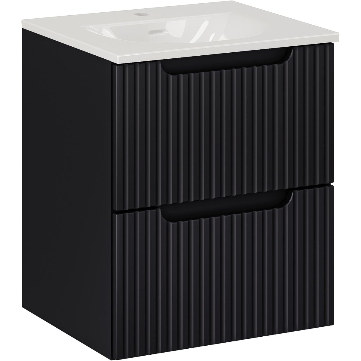 Les façades à structure de cannelures verticales fraisées ajoutent du caractère au meuble, et la poignée de couleur Black Mat s'intègre parfaitement à l'ensemble. L'ensemble se compose de deux éléments : un meuble-lavabo (référence : NOVA BLACK D2 82-50-2S) et un meuble-lavabo (référence : SKY 3 50 CM DP). Ces deux éléments ont été soigneusement sélectionnés pour créer un ensemble cohérent, à la fois pratique et esthétique.