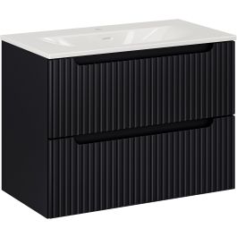 Le meuble lavabo mesure 80 cm de large et 40 cm de profondeur, ce qui lui permet d'accueillir de nombreux éléments de la salle de bains. Ses façades sont ornées de rainures verticales fraisées, ce qui confère une élégance supplémentaire à l'ensemble. Le meuble-lavabo s'intègre parfaitement au meuble, créant ainsi un ensemble cohérent et harmonieux.