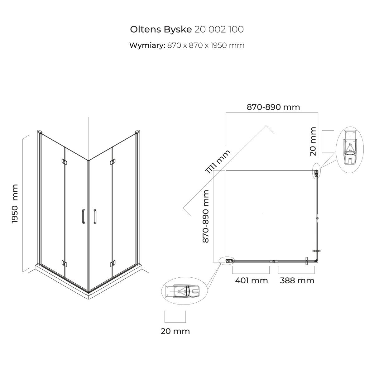 1. Cabine de douche 90 cm carré Oltens Byske 20002100