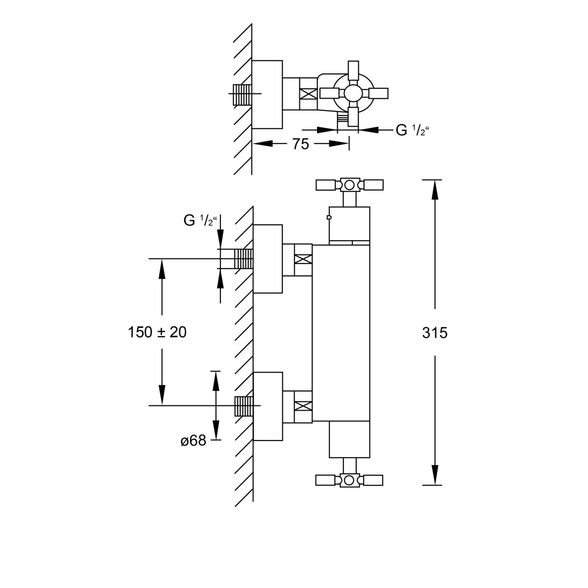 - largeur totale du robinet : 315 mm