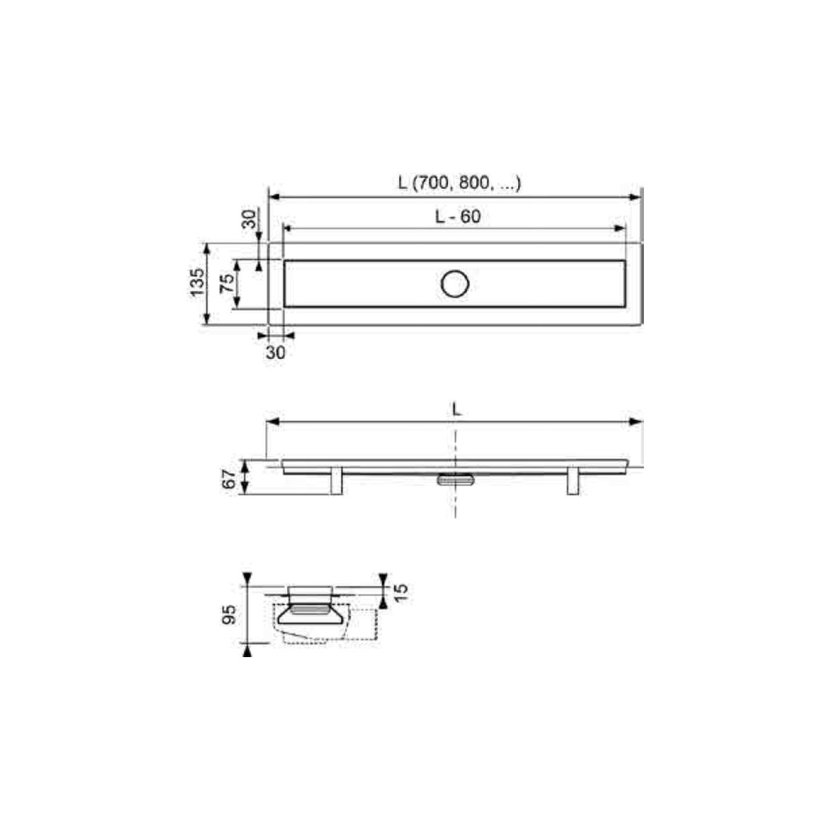 - l'ensemble comprend : gouttière, grille décorative réversible "2 en 1", pieds de montage, siphon 0,7 l/s, bride d'étanchéité