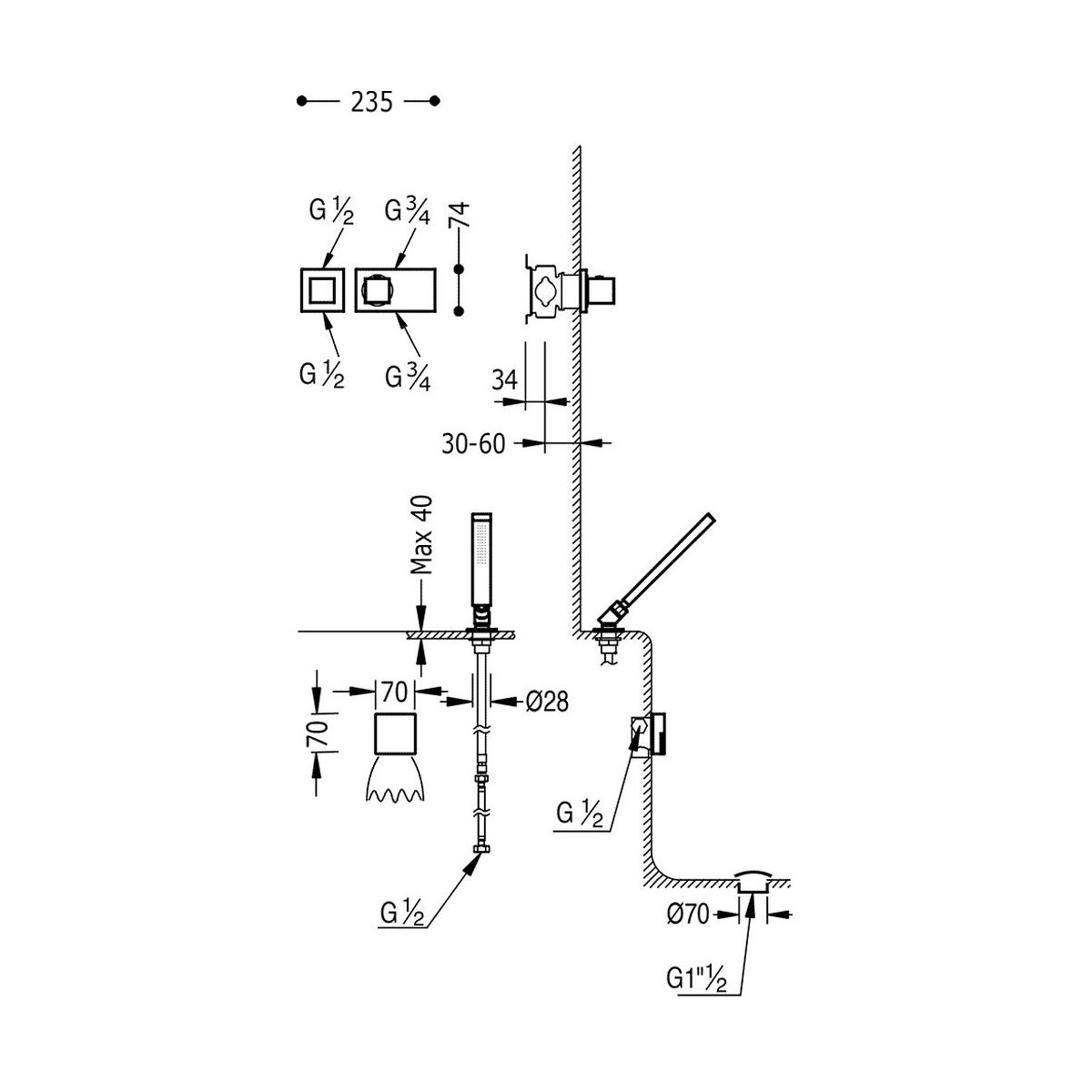 - Inclus: robinet avec inverseur, pommeau de douche, tuyau flexible de douche, raccord coudé, ensemble remplissage-évacuation