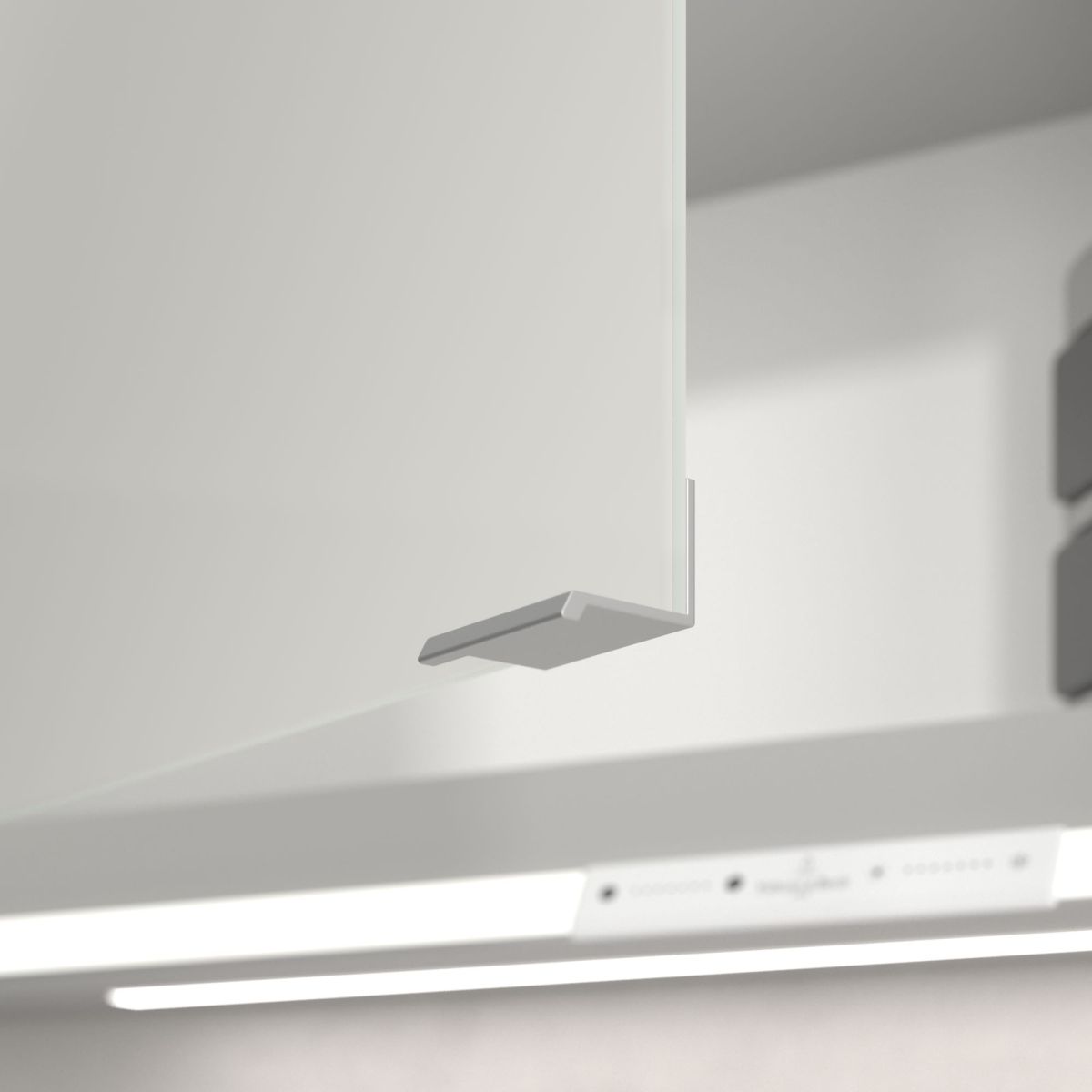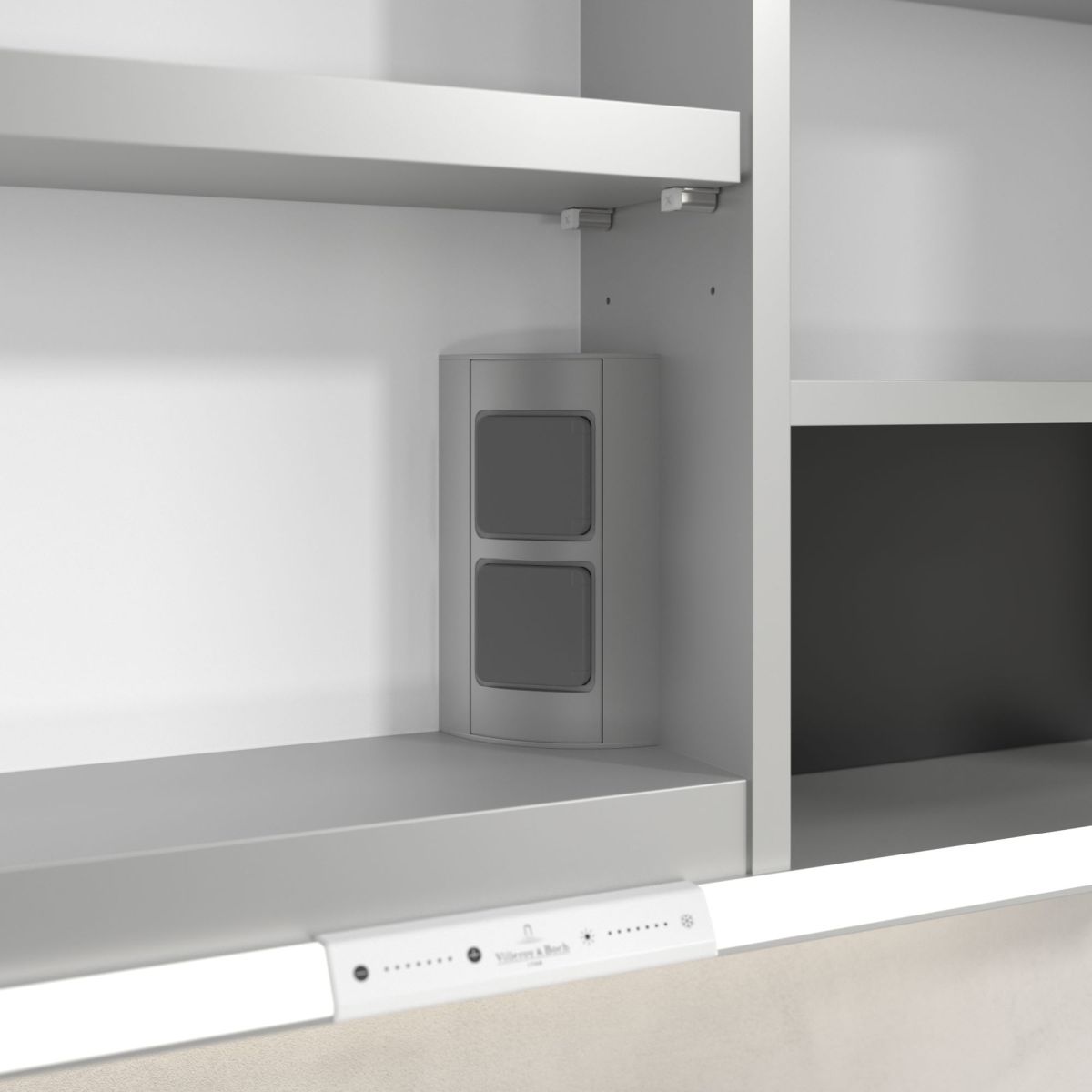 La bande LED qui entoure le miroir assure un éclairage uniforme, tandis que l'éclairage intégré du lavabo et les compartiments ouverts éclairés créent une atmosphère chaleureuse. La luminosité et la température de couleur peuvent être facilement réglées à l'aide d'un capteur ou d'un contrôleur Smart Home. Les poignées délicates permettent d'ouvrir facilement les portes sans laisser de traces de doigts, et la double prise à l'intérieur offre une fonctionnalité supplémentaire.