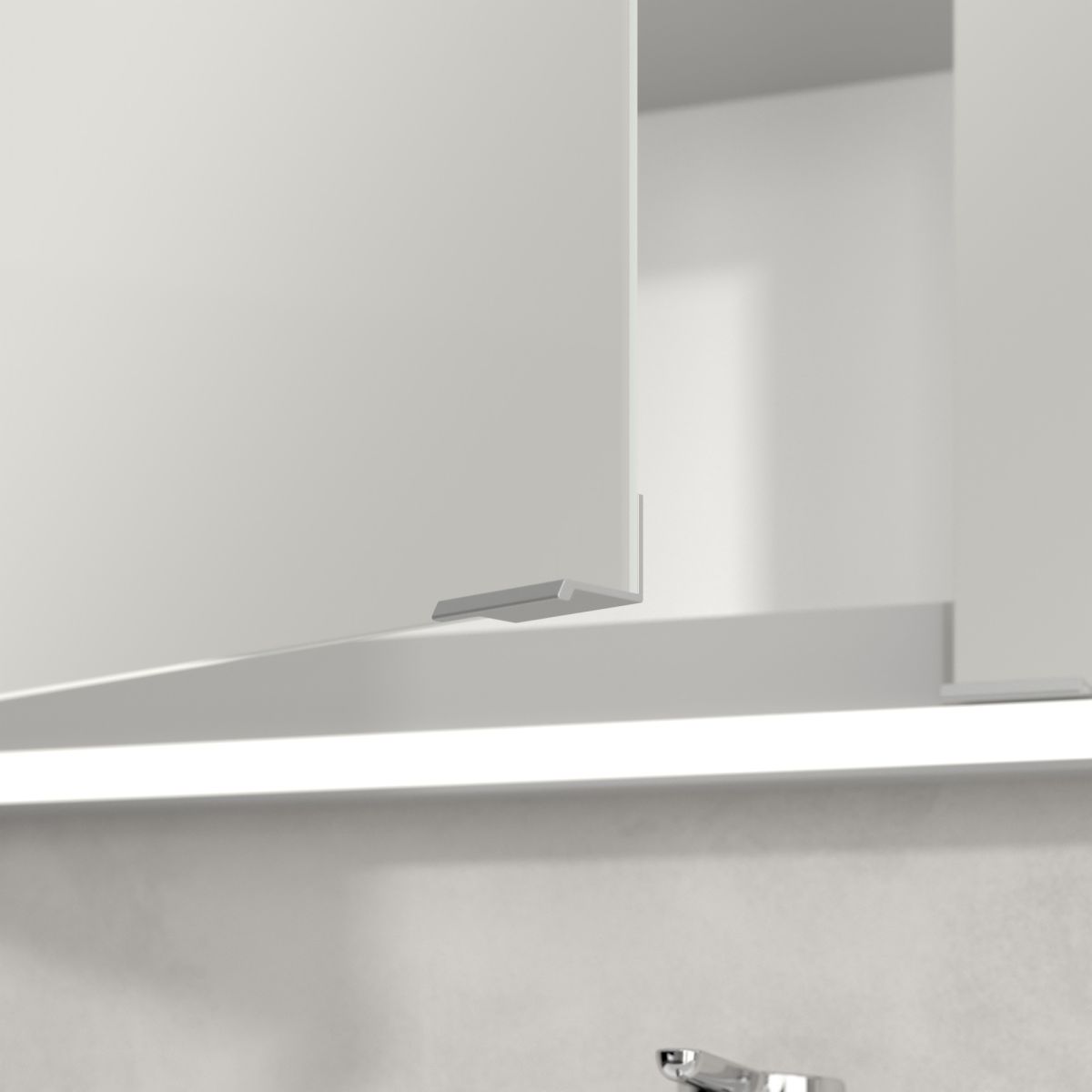 La bande LED qui entoure le miroir assure un éclairage uniforme, tandis que l'éclairage intégré du lavabo et les compartiments ouverts éclairés créent une atmosphère chaleureuse. La luminosité et la température de couleur peuvent être facilement réglées à l'aide d'un capteur ou d'un contrôleur Smart Home. Les poignées délicates permettent d'ouvrir facilement les portes sans laisser de traces de doigts, et la double prise à l'intérieur offre une fonctionnalité supplémentaire.