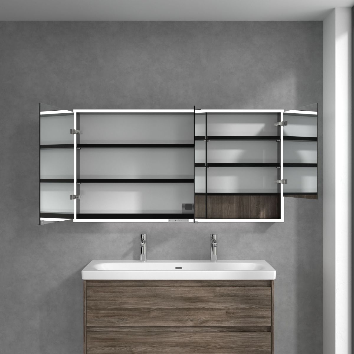 La bande LED qui entoure le miroir assure un éclairage uniforme, tandis que l'éclairage intégré du lavabo et les compartiments ouverts éclairés créent une atmosphère chaleureuse. La luminosité et la température de couleur peuvent être facilement réglées à l'aide d'un capteur ou d'un contrôleur Smart Home. Les poignées délicates permettent d'ouvrir facilement les portes sans laisser de traces de doigts, et la double prise à l'intérieur offre une fonctionnalité supplémentaire.