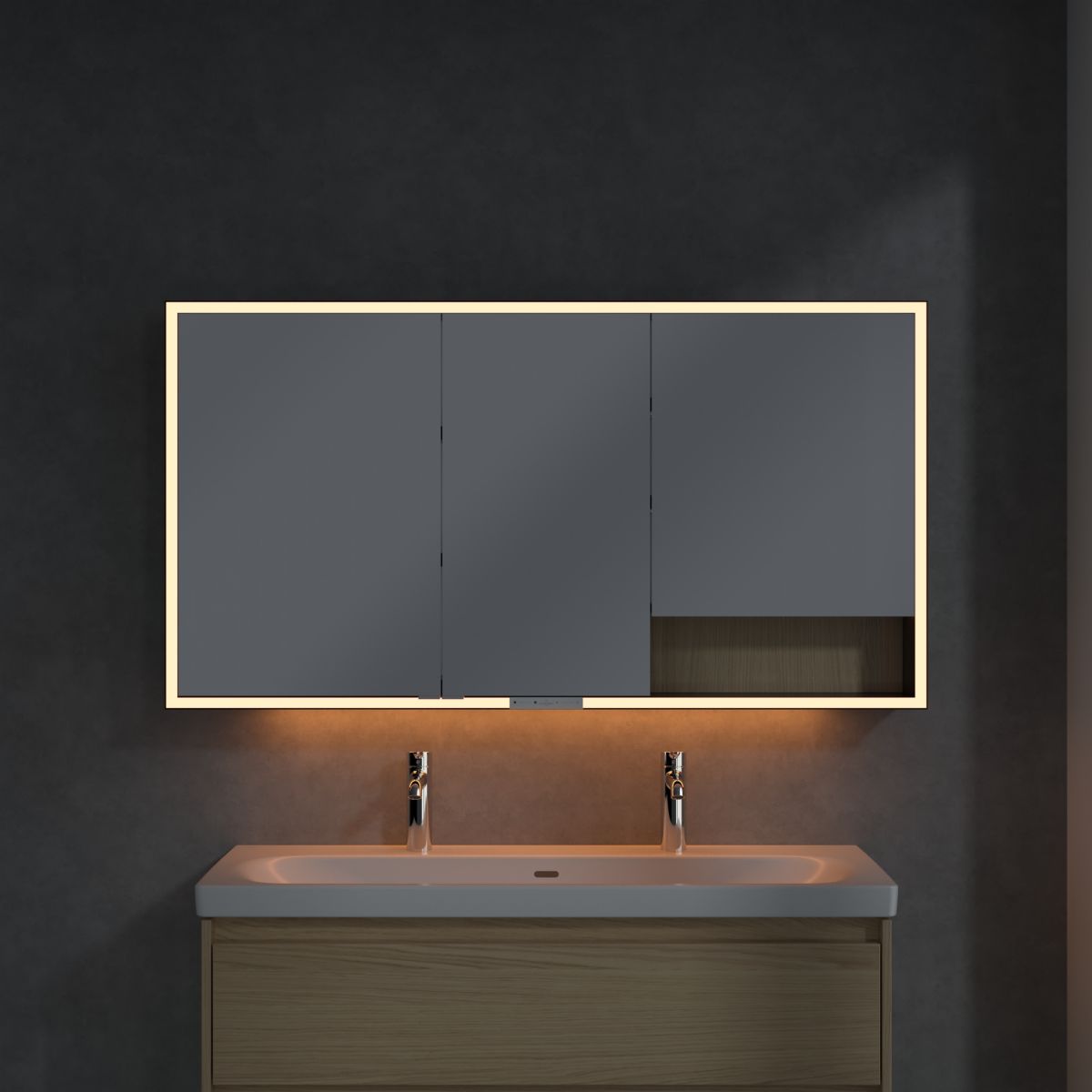 La bande LED qui entoure le miroir assure un éclairage uniforme, tandis que l'éclairage intégré du lavabo et les compartiments ouverts éclairés créent une atmosphère chaleureuse. La luminosité et la température de couleur peuvent être facilement réglées à l'aide d'un capteur ou d'un contrôleur Smart Home. Les poignées délicates permettent d'ouvrir facilement les portes sans laisser de traces de doigts, et la double prise à l'intérieur offre une fonctionnalité supplémentaire.