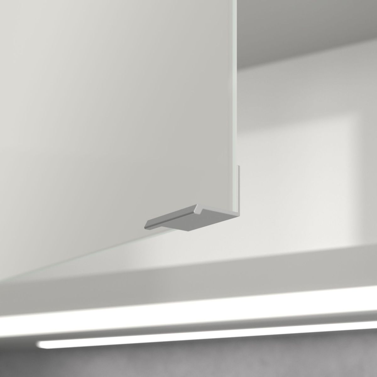 La bande LED qui entoure le miroir assure un éclairage uniforme, tandis que l'éclairage intégré du lavabo et les compartiments ouverts éclairés créent une atmosphère chaleureuse. La luminosité et la température de couleur peuvent être facilement réglées à l'aide d'un capteur ou d'un contrôleur Smart Home. Les poignées délicates permettent d'ouvrir facilement les portes sans laisser de traces de doigts, et la double prise à l'intérieur offre une fonctionnalité supplémentaire.
