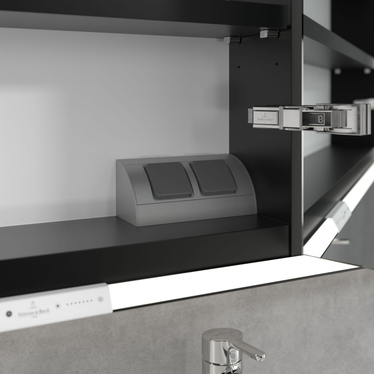 La bande LED qui entoure le miroir assure un éclairage uniforme, tandis que l'éclairage intégré du lavabo et les compartiments ouverts éclairés créent une atmosphère chaleureuse. La luminosité et la température de couleur peuvent être facilement réglées à l'aide d'un capteur ou d'un contrôleur Smart Home. Les poignées délicates permettent d'ouvrir facilement les portes sans laisser de traces de doigts, et la double prise à l'intérieur offre une fonctionnalité supplémentaire.