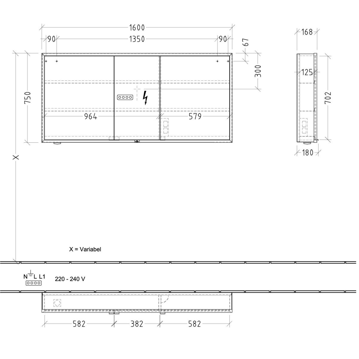 - équipement : 3 x portes, 1 x interrupteur tactile à l'extérieur, 2 x prises à l'intérieur, 4 x étagères en aluminium, 1 x compartiment ouvert à droite en bas, 1 x bac, 1 x miroir grossissant, 1 x barre magnétique- matériau du corps : aluminium
