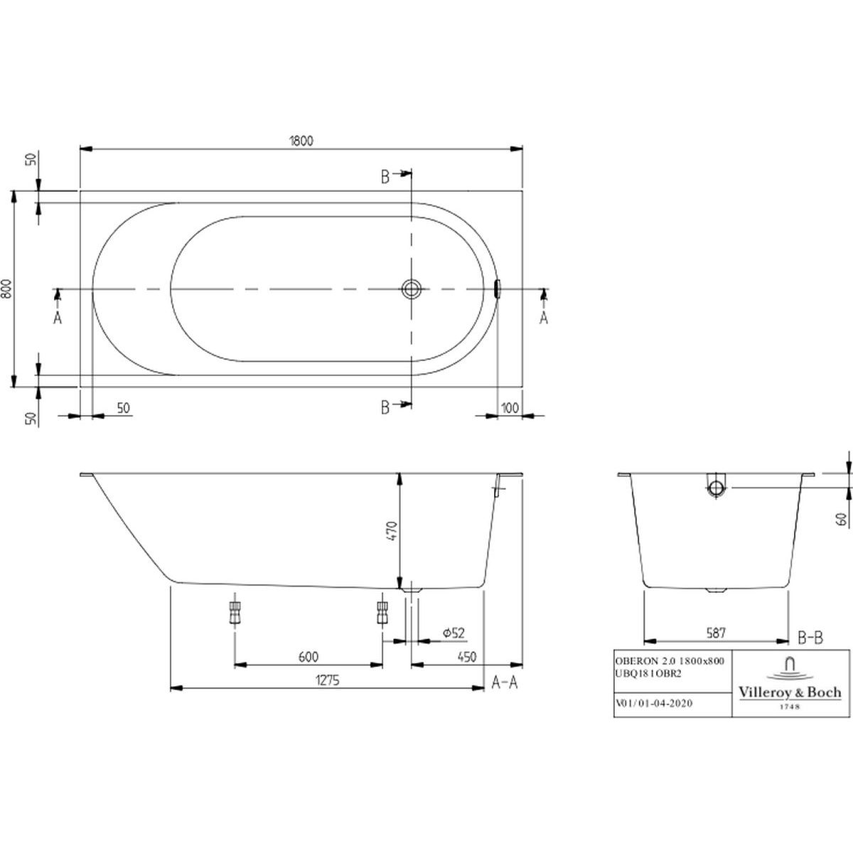 Villeroy & Boch Oberon baignoire rectangulaire 180x80 cm blanc UBQ181OBR2DV-01