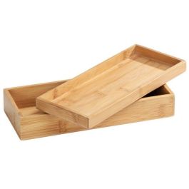 Deux bacs de tailles différentes, en bambou, vous permettront de ranger vos accessoires de salle de bains et vos petits objets. Il sera ainsi plus facile de garder la salle de bains en ordre. La partie la plus petite (qui ferme le récipient) peut également être utilisée pour ranger de petits objets.